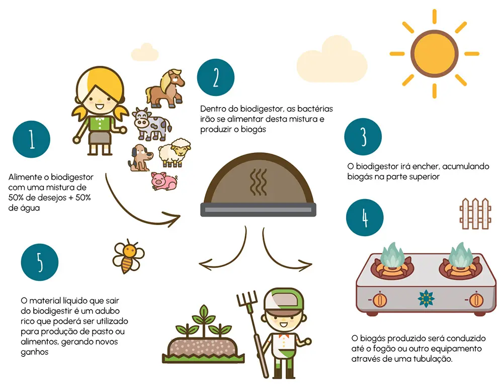 biogás para cozinhar, aquecer e gerar energia elétrica